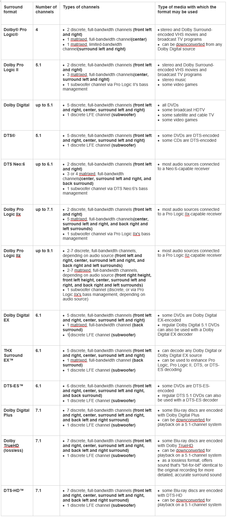 لدينا في الجدول التالي تنسيقات نظام الصوت المحيطي، وكم قناة صوتي يدعم، و