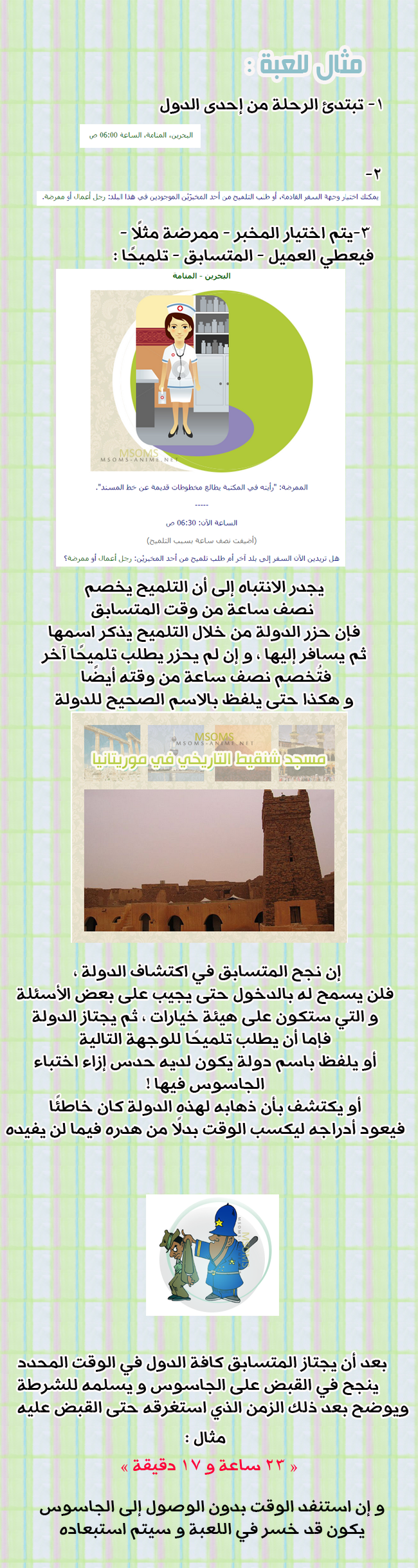 رابعاً: عند الانتقال من دولة إلى أخرى يُخصم من الوقت الزمن المستغرق في التنقل بين هذه الدول، ويعتمد الزمن المستغرق على سرعة طائرة المخبر وعلى المسافة الحقيقية بين الدولتين، فالسفر من المغرب إلى العراق مثلاً سيخصم من وقتك زمنا أكبر من السفر من المغرب إلى تونس..