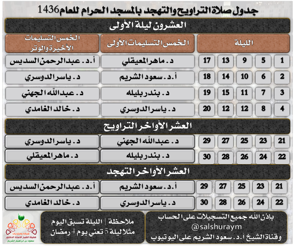 الجدول النهائي للحرم المكي .. يعطي اغلب الليالي للشيخ ياسر الدوسري - بعدما كانت للمعيقلي- قدر الله وما شاء فعل-انا افضل المعيقلي- .. وفي كلٍ خير إن شاء الله