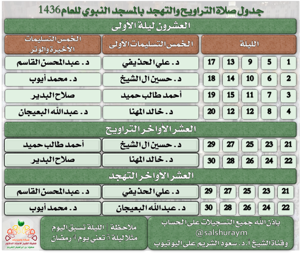 بالنسبة للحرم المدني فقد اعتذر الشيخ عبد الباري الثبيتي عن الامامة -مثل العام السابق- وعاد الشيخ محمد ايوب بعد سنوات من توديع الحرم المدني كذلك تكليف الشيخ خالد المهنا ومع وجود صاحب الصوت الندي الشيخ عبد الله البيجعان سنري تراويح مفعمة بالروائع باذن الله .. لننتظر ..