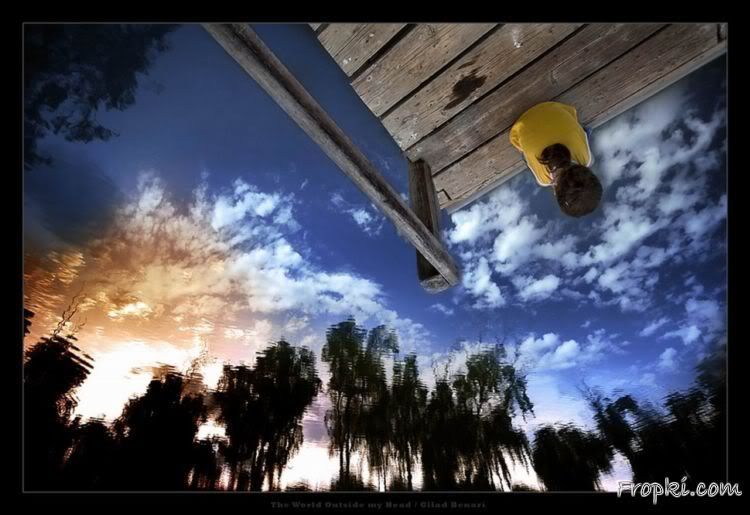 على ما اظن ما في الا تفسير واحد لهاذ الصورة...ولد قاعد على جسر تحته ماء بوسط الغابة..؟؟..و انعكست صورة السحاب و الاشجار على الماء و الصورة التقطت من فوق اي بشكل عكسي ...مارسي على الصورة لحلوة